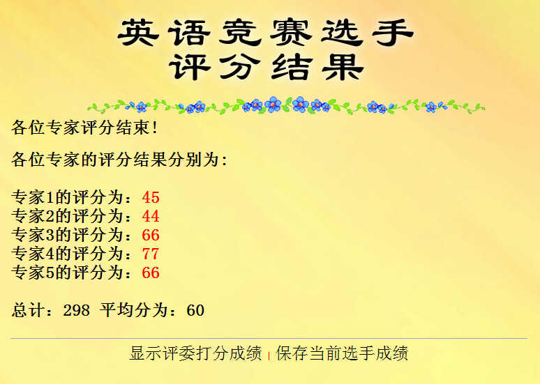 各位专家可以集中对一位表演者评分,所有专家评分结束,自动统计当前选手的总分与平均分 主持人可以选择保存成绩到数据库中。