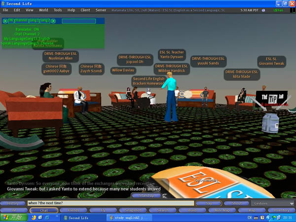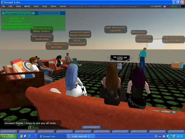 [5:03] klita Slade: in the morning I had to do english lesson [5:03] klita Slade: but in the afternoon [5:03] Yanto Dyrssen: ...*In the... *English... [5:03] You: who is the teacher? [5:04] [Chinese]: 谁是老师? [5:04] klita Slade: I visited the city [5:04] klita Slade: Any park [5:04] klita Slade: Hide park [5:04] Yanto Dyrssen: I am, jcqcool. [5:04] ohye Oh is Offline [5:04] Yanto Dyrssen: Klita: ...*some parks... [5:04] Bracken Homewood: Hyde Park [5:04] Kunika Yoshikawa: 老子? [5:05] Yanto Dyrssen: Hello bing, hello jcqcool. [5:05] You: hello [5:05] [Chinese]: 你好 [5:05] bing Qunhua: 好 [5:05] Multi-Lingo Translator: please select a new chat channel. [5:05] Multi-Lingo Translator: change chat channel to 2 [5:05] Willow Daviau: Did you undestand people Klita? Did you meet people? [5:05] Yanto Dyrssen: ...*understand... [5:06] klita Slade: yes, my class was like this one [5:06] Willow Daviau: understand [5:06] Bracken Homewood: Wibber, how long did you spend in LA? [5:06] Wiibber Handrick: about 10 days [5:06] klita Slade: some spanish, japanese, italian also [5:06] Bracken Homewood: Was your visit business, holiday or educational? [5:06] Yanto Dyrssen: ...*Spanish, Japanese, Italian... [5:07] klita Slade: ty Yanto [5:07] Wiibber Handrick: holiday [5:07] Yanto Dyrssen: ...*Holiday... [5:07] You: wellcome to China,If you have time [5:07] Bracken Homewood: Did you need to used English while you were there? [5:08] Wiibber Handrick: i've ever been to Main Land China [5:08] Yanto Dyrssen: Wibber: *I've never... [5:08] Wiibber Handrick: i was with my ex-girl friend. [5:08] Bracken Homewood: * nedd to use [5:08] Bracken Homewood: GRRRR *need to use [5:08] You: where had you been to?the place. [5:09] The Tip Jar: Thank you for your donation :) [5:09] Wiibber Handrick: 蘇州 [5:09] Giovanni Tweak gave you DRIVE-THROUGH ESL CLASS INTRO CHI. [5:09] Wiibber Handrick: 上海 [5:09] Yanto Dyrssen: jcqcool: *Where did you go? [5:09] Bracken Homewood: Did your girlfriend speak English? [5:09] Wiibber Handrick: my ex studied there about 6 yrs [5:10] bing Qunhua is Offline [5:10] Yanto Dyrssen: Wibber: *My... ...for about six... [5:10] Wiibber Handrick: she is English-fluent [5:10] Wiibber Handrick: thanks [5:10] bing Qunhua is Online [5:10] Yanto Dyrssen: Wibber: ...*fluent in english... [5:10] Yanto Dyrssen: Oops *English... [5:11] Wiibber Handrick: thanks again [5:11] Wiibber Handrick: haha got you [5:11] Kunika Yoshikawa: you speak english ... teacher thanks [5:11] Yanto Dyrssen: Hello Zuyzh. [5:11] Bracken Homewood: So does that mean you didn't learn much English? Or did she make you try to speak English? [5:12] Yanto Dyrssen: Kunika: ...*English... [5:12] You: yanto,here can say anything?my english is poor. [5:12] Zuyzh Szondi: Hello [5:12] Yanto Dyrssen: jcqcool: *Yanto...can I say something? [5:12] Wiibber Handrick: No, I learn English, because it is very useful [5:13] Yanto Dyrssen: No problem, jcqcool. Just try. [5:13] Yanto Dyrssen: Wibber: *I had learnt English... [5:13] Zuyzh Szondi: Cool [5:13] Kunika Yoshikawa: English is writing letters [5:13] Zuyzh Szondi: Are we all Chinese? [5:14] Kunika Yoshikawa: not speaking word [5:14] Yanto Dyrssen: No, Zuyzh. I'm not! LOL [5:14] You: I'm Chinese,come from land of china [5:14] Bracken Homewood: We are all different nationalities Zuyzh [5:14] Zuyzh Szondi: Brilliant [5:14] You: Wher are you come from? [5:14] Yanto Dyrssen: jcqcool: *I come from the land of China... [5:15] Zuyzh Szondi: I'm now in UK [5:15] Yanto Dyrssen: jcqcool: *Where do you come from? [5:16] Bracken Homewood: Whereabouts in the UK are you living Zuyzh? [5:16] Yanto Dyrssen: I'm from California, but I live in France. [5:16] You: lol,thanks. [5:16] Zuyzh Szondi: Southampton, you in Uk too? [5:16] Bracken Homewood: Yes. I live in London. [5:17] Yanto Dyrssen: Zuyzh: ...*Are you in THE UK too? [5:17] Wiibber Handrick: California is so beautiful. [5:17] Zuyzh Szondi: Cool, nice to meet you [5:17] You: London is a beautiful city. [5:17] You: I had saw it in TV. [5:17] klita Slade: for me, London is the most beutiful city [5:18] Yanto Dyrssen: jcqcool: *I have seen it...on TV. [5:19] Yanto Dyrssen: Yuuuki, I'm glad to see you back. [5:19] yuuuki Sands: Thank you Yanto [5:19] Willow Daviau: Is it "on" Second Life too? [5:20] Yanto Dyrssen: Willow: No, we say "in" Second Life. [5:20] Willow Daviau: Okay thanks [5:20] Zuyzh Szondi: There's nothing to say, shall we have some topic? [5:20] Yanto Dyrssen: But we say "on" the site. [5:20] Yanto Dyrssen: Zuyzh: Where are you from in China? [5:21] Yanto Dyrssen: Hello Nuolinian. [5:21] Zuyzh Szondi: I'm from Sichuan province, city Chengdu [5:21] Zuyzh Szondi: greate place [5:21] Kunika Yoshikawa: what is strange o or in? [5:21] Kunika Yoshikawa: on* [5:22] Yanto Dyrssen: Chengdu? Wonderful. Chengdu is twinned with my city in France. [5:22] You: I come from Dalian. [5:22] Kunika Yoshikawa: o the sofa ... in the sofa? [5:22] Yanto Dyrssen: Chengdu is the site of the China Eastern Airlines training center, I believe. [5:22] Kunika Yoshikawa: on* [5:22] Yanto Dyrssen: Kunika: 'on' the sofa. [5:22] Zuyzh Szondi: Oh [5:23] Yanto Dyrssen: At my school in France we've had a lot of students from Chengdu. [5:23] Kunika Yoshikawa: yes ... in the world on the soa [5:23] Kunika Yoshikawa: sofa* [5:24] Yanto Dyrssen: Kunika: yes. [5:24] Yanto Dyrssen: Ask Zuyzh some questions about Chengdu. [5:24] Willow Daviau: What is the principal language there? [5:24] Zuyzh Szondi: There's a university called civil aviation flight univeristy, all pilots are from there [5:24] Yanto Dyrssen: Nuolinian, tell us something about yourself. [5:24] You: Chengdu is hot,now? [5:25] yuuuki Sands: Mandarin ? [5:25] Nuolinian Allen: I'm from Russia [5:25] Nuolinian Allen: The city of Nalchik [5:25] Nuolinian Allen: Learning english [5:25] Zuyzh Szondi: Yanto, what's your city now ? [5:25] Yanto Dyrssen: nuolinian: *I'm learning... [5:25] Wiibber Handrick: is air pollution